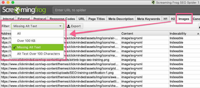 Make sure all your images have an alt text so that Google and other search engines can identify what these images are about. Click on the “Images” tab and select from the filter “Missing Alt Test” and you will find a list of images that do not have an alt text. Make