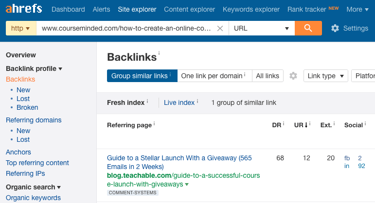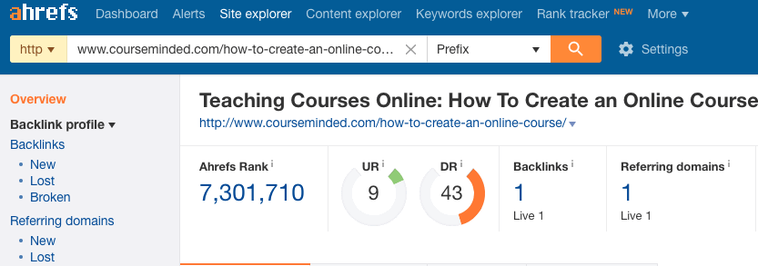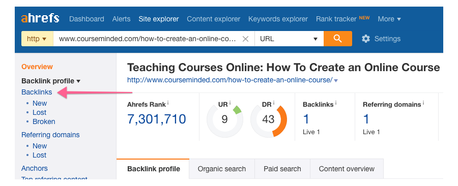 For the off-page optimization audit we will use ahrefs to find and analyze backlinks, but the same can be accomplished using tools like SEMRush, Open Site Explorer, or Majestic.