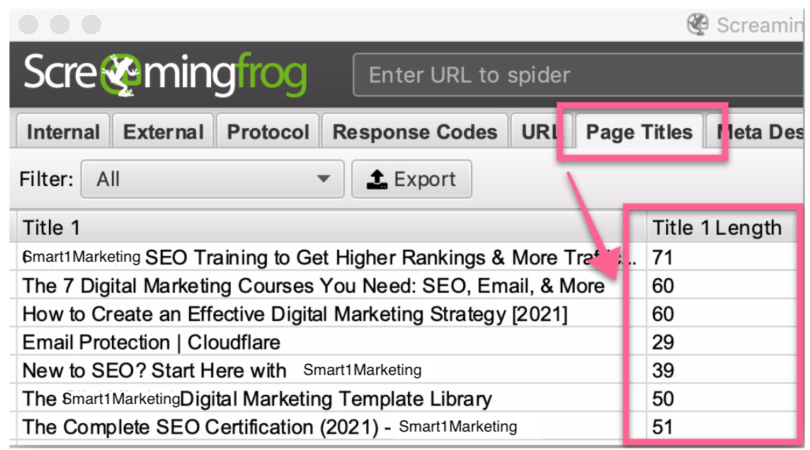 Click the “Page Titles” tab and look for the “Title 1” columns, this is the title that shows up on Google search results.