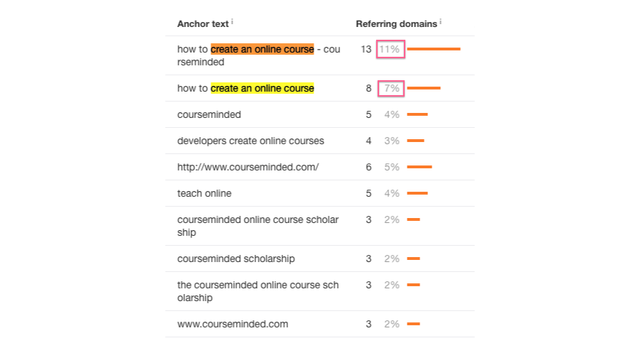 Add up the percentages of the “Referring domains” column for Anchor texts that contain the exact primary target keyword (the find function should’ve highlighted them)