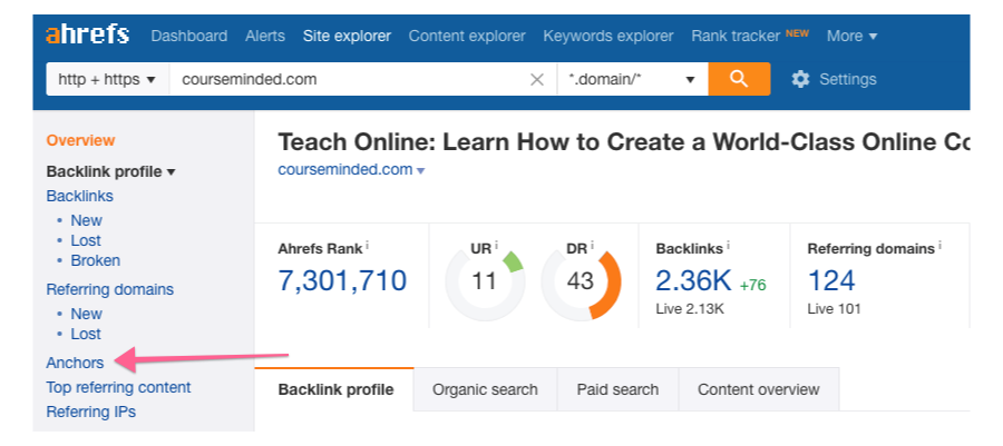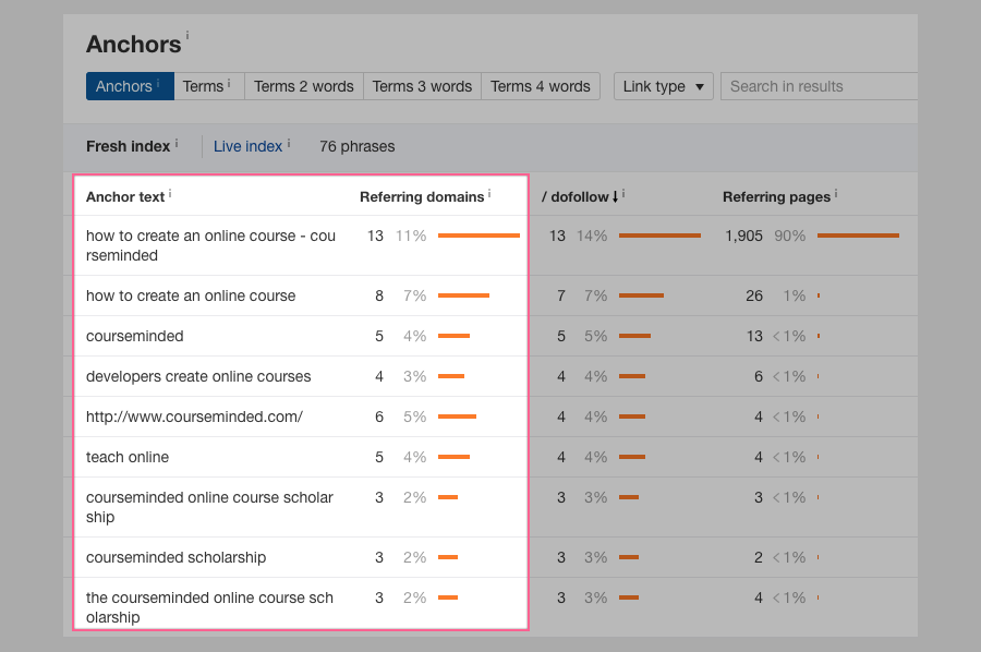 We will focus only on the “Anchor text” and the “Referring domains” columns