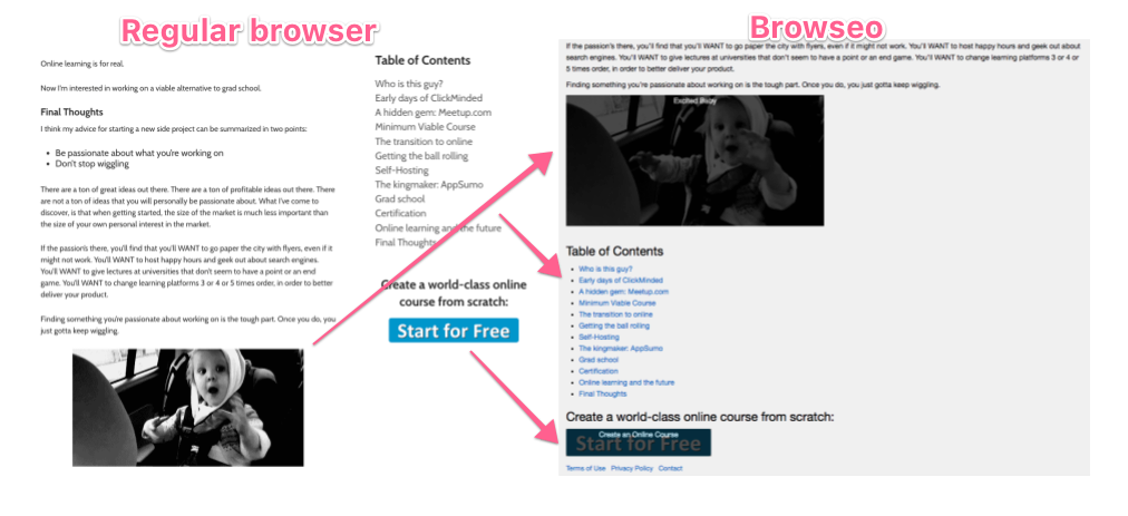 Check that all of the content that you can see on the page is also visible to search engines (i.e. everything on the page also shows up on Browseo’s results)—it doesn’t matter if it doesn’t look the same or if it isn’t in the same order, Browseo doesn’t load the page styles.