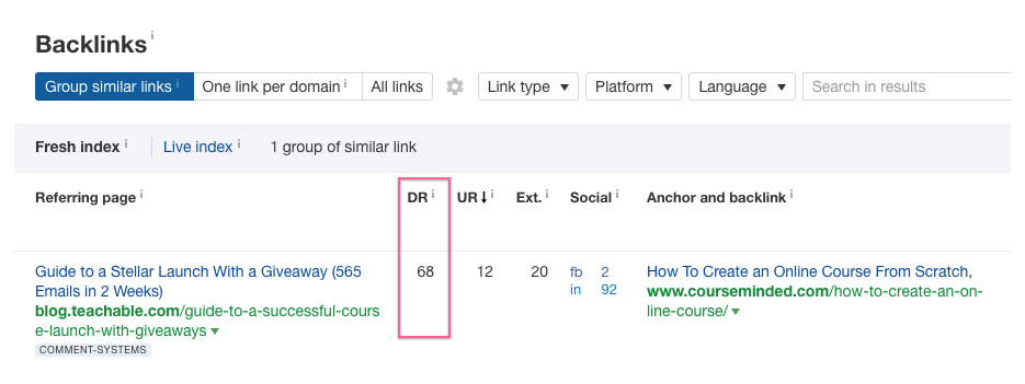 Check that at least half of the backlinks come from sites with DR (domain ratings) above 30