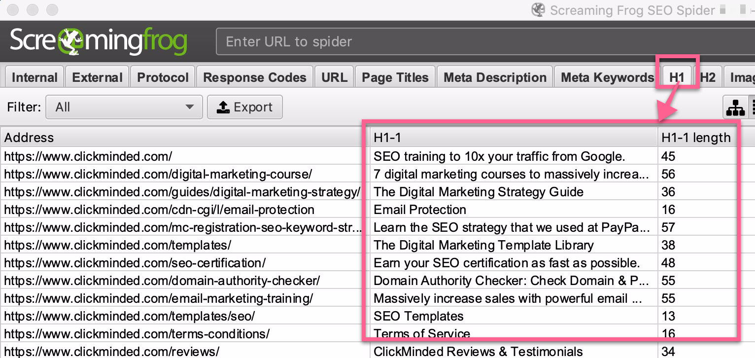 Click on the “H1” tab. Look for the “H1-1” column result and check for both number of H1 tags and keyword