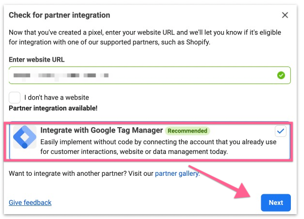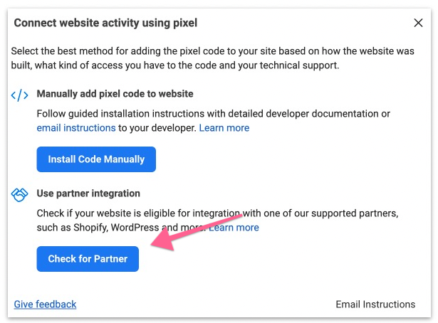 You will be presented with two options. 1) Manually add pixel code to the website or 2) Use partner integration. Select “Check for Partner”.