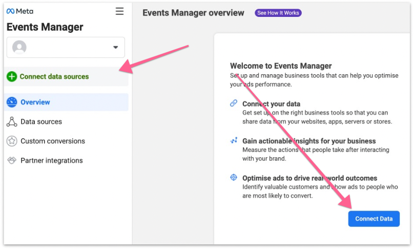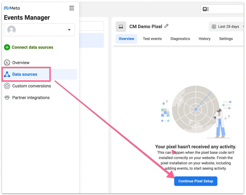Next, select “Data sources” from the sidebar and click “Continue Pixel Setup”.