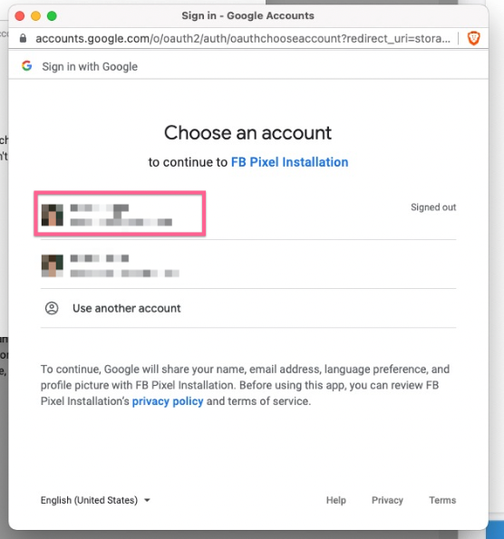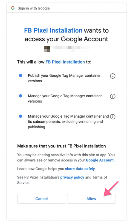 Next, you will be prompted to sign in to the Google Account you use for Google Tag Manager and will need to allow Facebook to make changes.