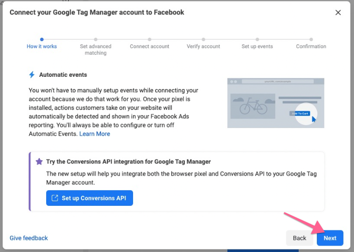 You will be taken on the onboarding workflow to connect your Google Tag Manager account to Facebook. In the first screen, click “Next”.