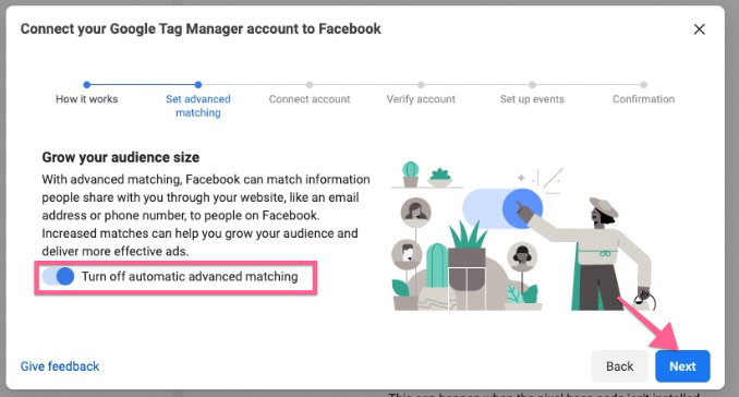 You will be asked If you want to turn on “Advanced Matching”. If you are an advanced Google Tag Manager user you might want to configure it now. If not, leave it “Off” and click “Next”: