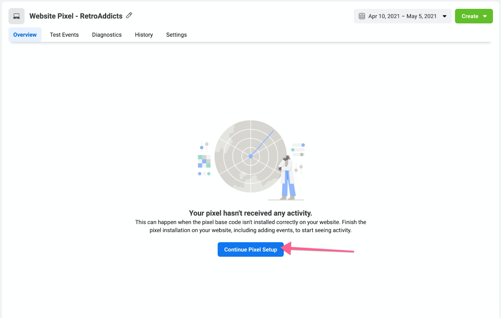 You might see a warning that mentions that the pixel hasn’t received any events. This is normal since you’ve just installed it.