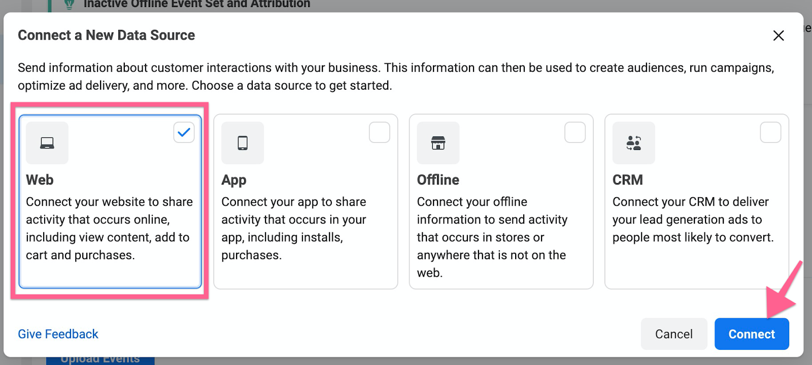 Select “Meta Pixel” from the list, and click “Connect”. If you don’t see Meta Pixel your UI probably isn’t updated yet, select Facebook Pixel instead.