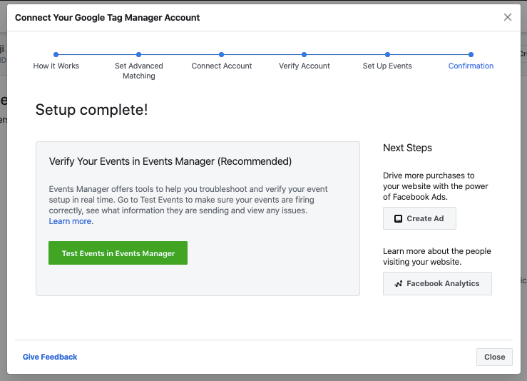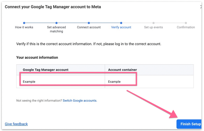 Verify that the Google Tag Manager account and container info is correct. Once confirmed, click “Finish Setup”.