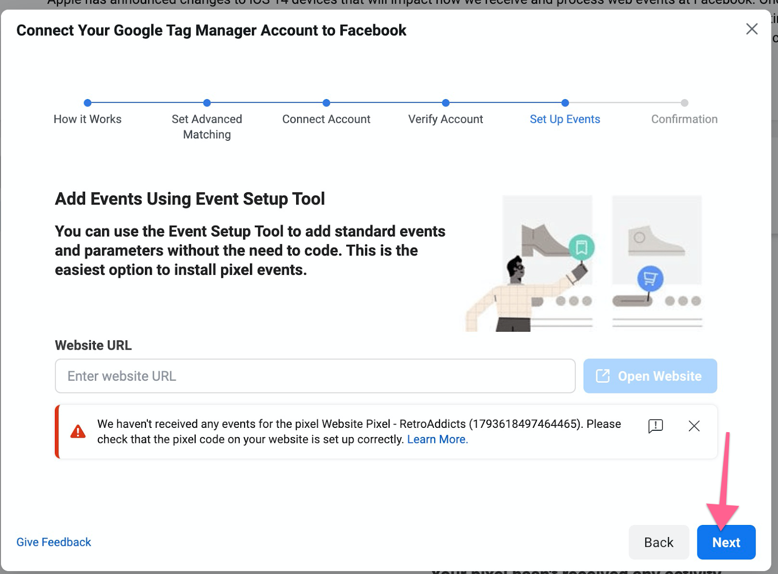 Next, you can choose to add events using the Event Setup Tool. Since you just want to add the Pixel Base Code, for now, you will just need to click “Next”.