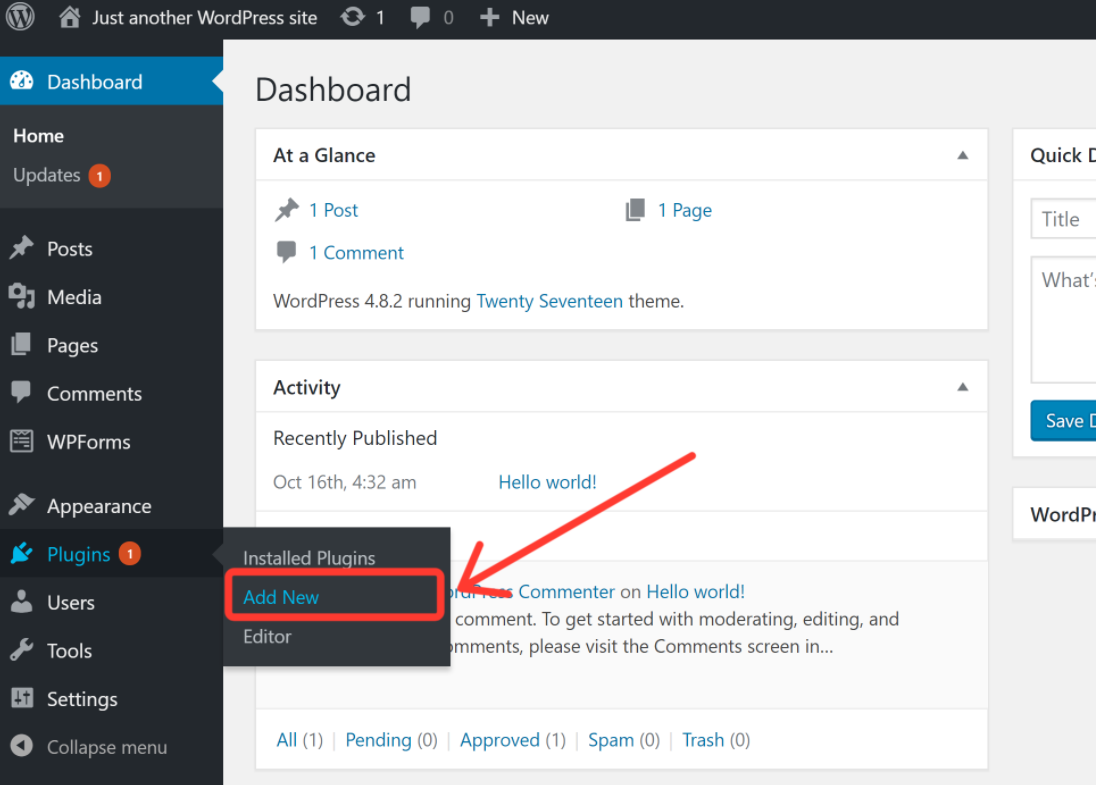 Inside the WordPress Admin Panel, head over to “Plugins” → “Add New”