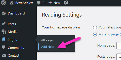 Click on Homepage Settings then select ‘A static page’ under ‘Your homepage displays.’
