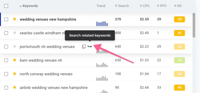 Once you are done with selecting keywords from the first list KWFinder pulled, make sure to always go in-depth with your research. Do this by taking each of the keywords in the list and searching its related keywords. To do this, click on the arrow right next to the keyword itself.