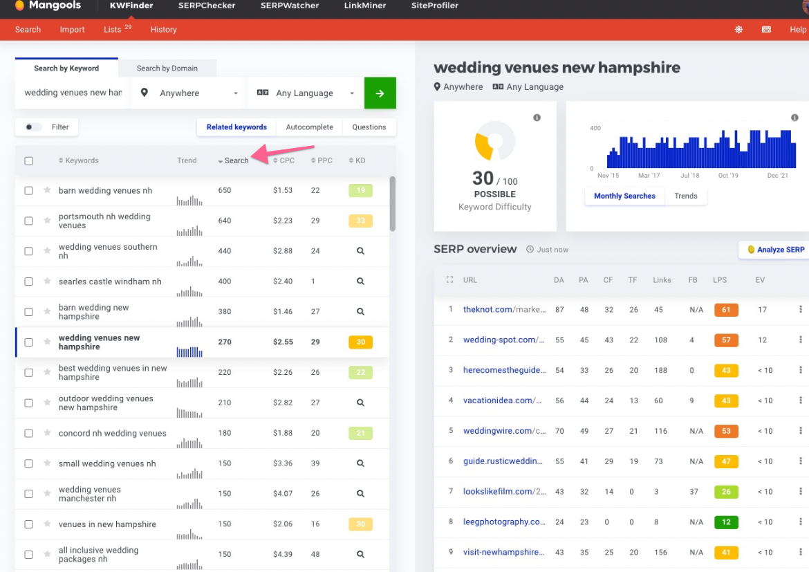 Our suggestion is this: use a broader location (country) in the beginning - you can narrow it down by using a specific search term (e.g. “wedding venue New Hampshire”, the primary keyword we used in the example). Doing this will help you find more keywords (both general and location-specific).