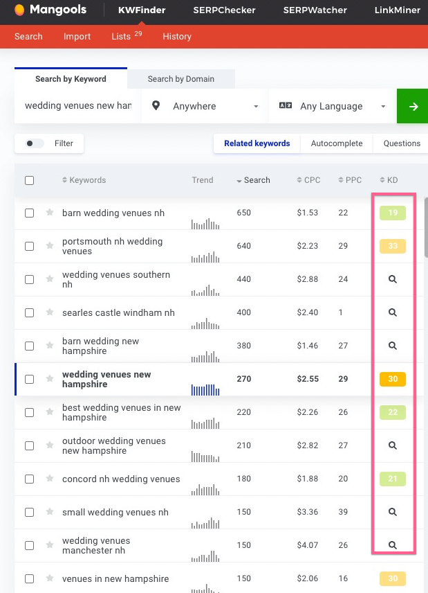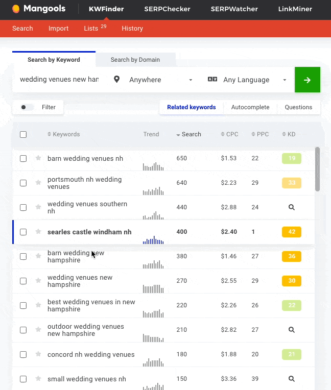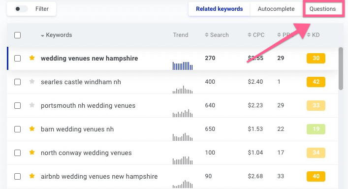 Repeat the same keyword research process with the “Questions” tab. This will pull a list of question-based search terms. With this feature, you might have to work with a broader keyword (“wedding venue” instead of “wedding venue in New Hampshire”, for example).The keyword phrases you will select will most likely be excellent ideas for blog topics, so you should add the suitable ones to your list as well.