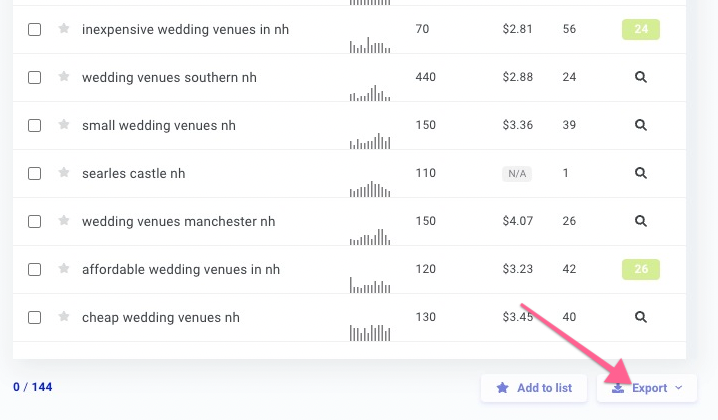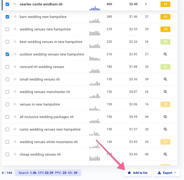 Add the ticked keywords to your list. You can do this by clicking on the green “Add to list” button at the bottom of the page. If this is a new project, you will have to create a new list (e.g. “New Hampshire Wedding Keyword Research”). If you have been working on this project before, you will simply have to select the list you want for these keywords.