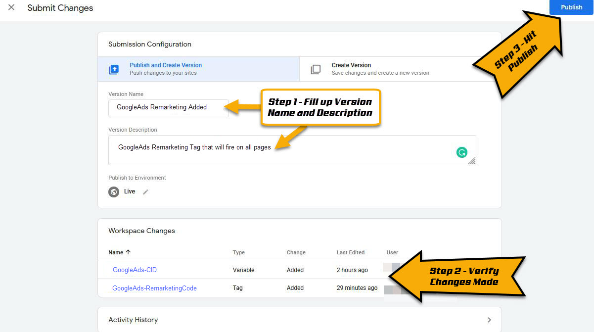 In the Submission Configuration panel, you will be given the chance to add a name and description to this version. After you have done so, hit “Publish”.