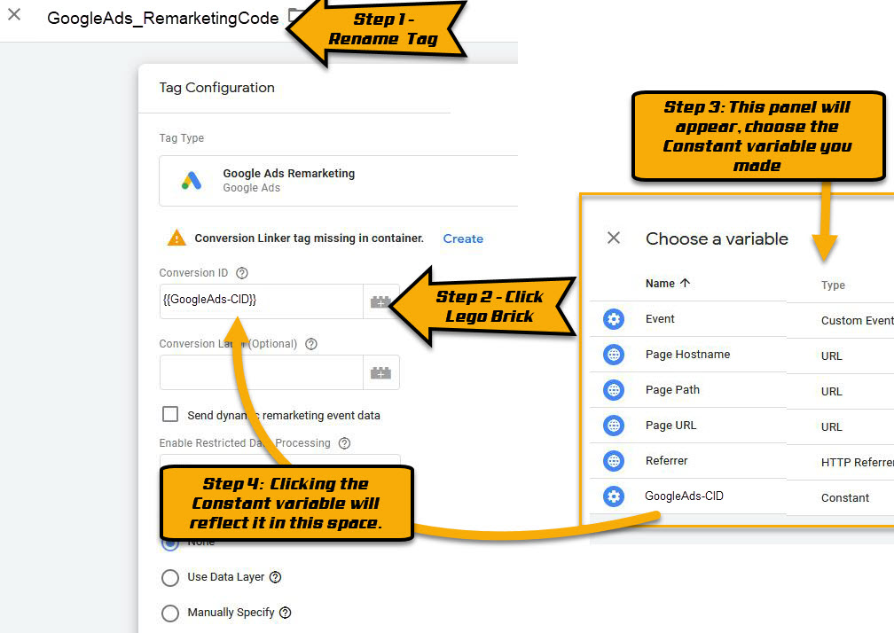 Rename your tag, and in the ‘Conversion ID’ field, you will want to select the variable you have just created in the previous step: