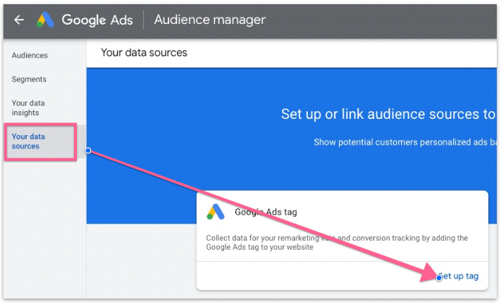 On the left sidebar, click on Your data sources’ and then click on Set up tag: