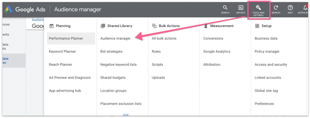 Go to your Audience Manager either by following this link, or by clicking on wrench icon labeled ‘Tools’ at the top, followed by “Audience Manager”: