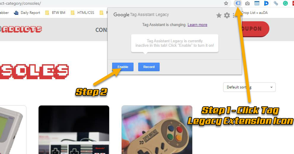 On your browser, click on the Tag Assistant Legacy icon. An extension panel will pop down, then click on ‘Enable.’
