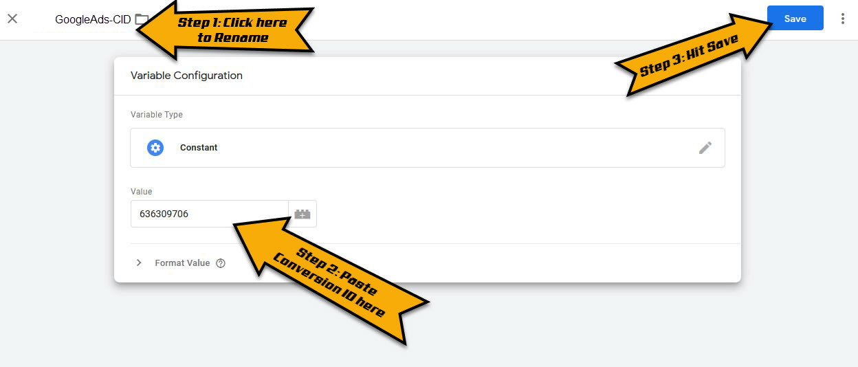 Paste the Conversion ID provided by Google Ads in the earlier steps of this SOP and hit ‘Save’: