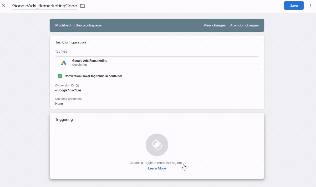 All we are missing now is setting up the rule so that it triggers on all pages. To do that, click on the interlocking circle icon above ‘Choose a trigger to make this tag fire…’ then select ‘All pages’ and lastly, hit the ‘Save’ button at the topmost right portion: