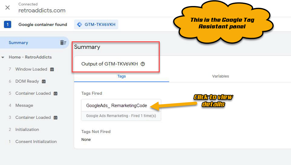 The Google Tag Assistant panel will also show a summary of tags fired: