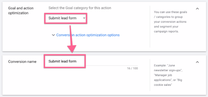 Conversion name: Google will auto-fill the conversion name based on what you’ve selected in “Goal and action optimization”. You’re allowed to edit the name as you see it as long as it’s short and intuitive; it should be obvious to you or anyone what it is about since this name will appear on your reports.