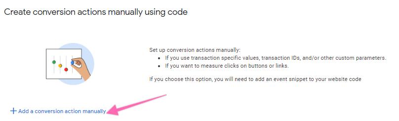 Once successfully scanned, you will have the option to create conversion actions manually using code. Click “+ Add a conversion action manually”.