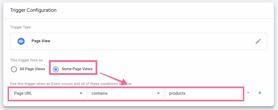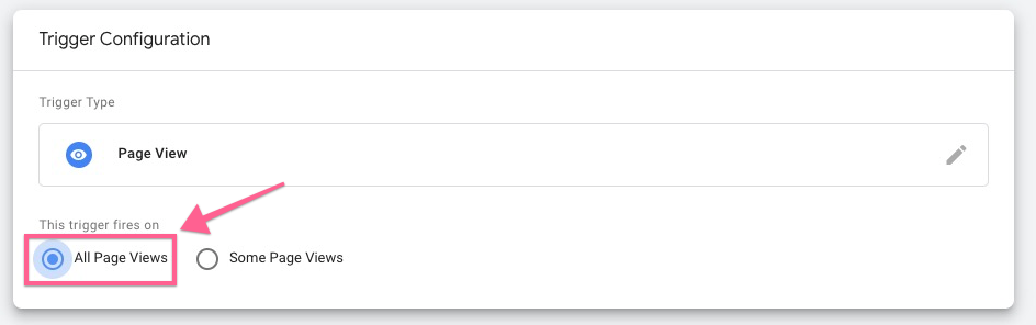 Under the trigger firing rule, select “all pages”. This is recommended for most cases unless you only want to track specific pages, which you then select “some page views” and only fire when the Page URL contains a certain word (e.g., products).