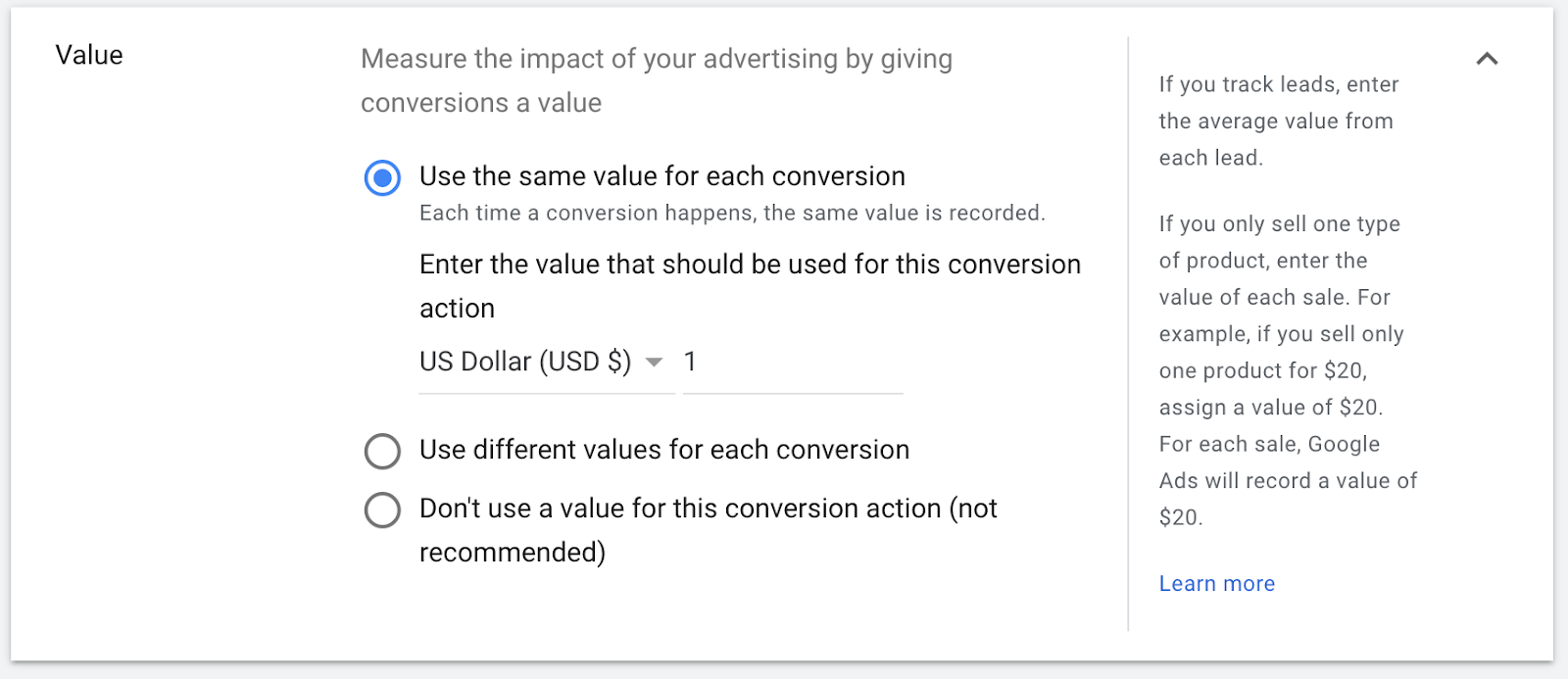 Value: This field is optional but recommended. If you can estimate how much this conversion is worth, you should enter it here.