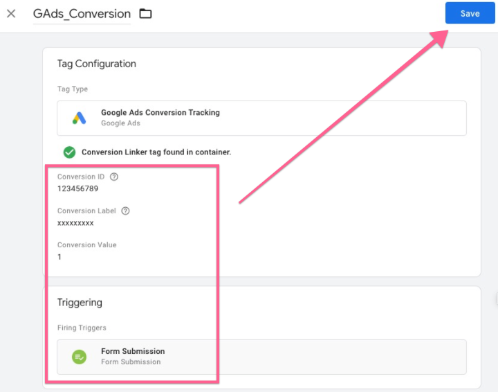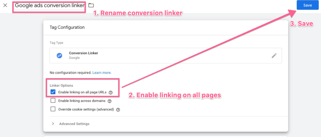 In the conversion linker settings, rename the tag and enable linking on all pages, then click “Save”. The Conversion linker tags are used to help tags measure click data so that conversions are measured effectively.