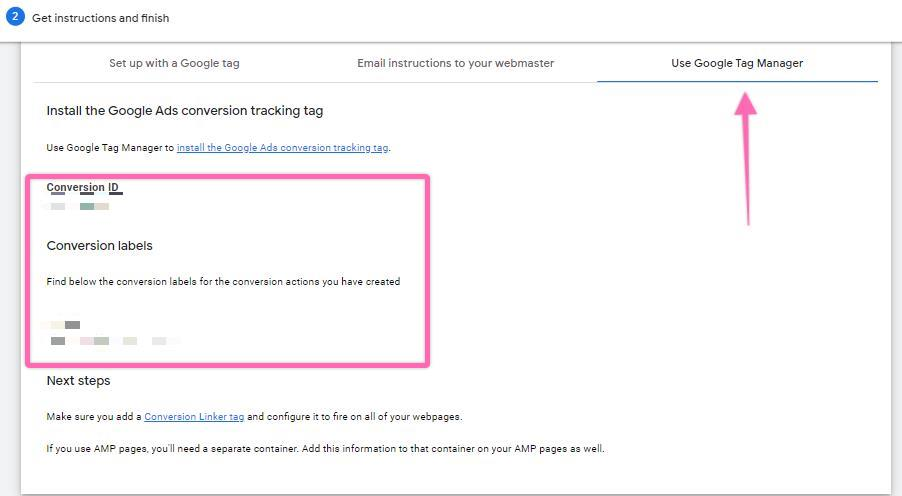 For the purpose of this task, we will choose Use Google Tag Manager. Take note of your ‘Conversion ID’ and ‘Conversion label.