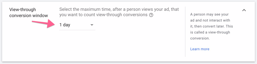 Usually, you will want to set this window to a lower value than the one you’ve selected for your ‘Clickthrough conversion window’ or else you might end up with a lot of view-through conversions that are not necessarily attributed to the fact that the visitor viewed your ad.