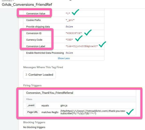 Clicking on the tab, you will see that all settings we configured are the correct Conversion Value, Conversion ID, Conversion Label, Currency Code, and even the trigger: