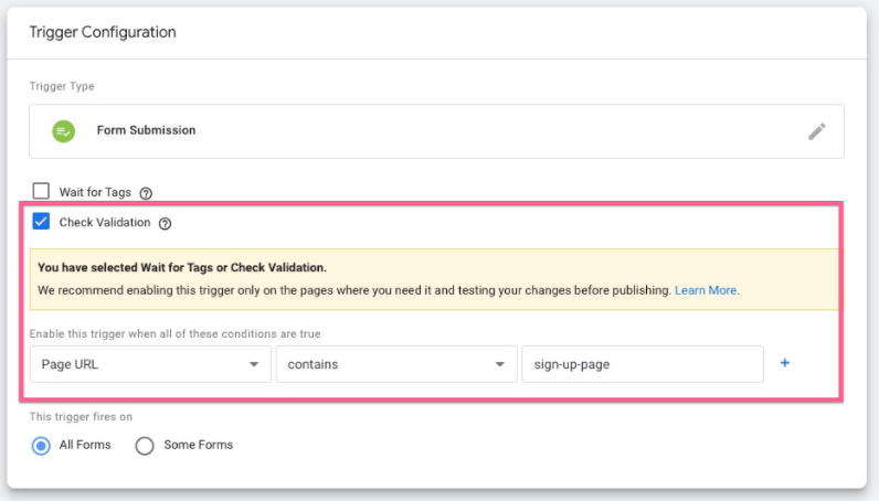 Under the trigger firing rule, select “Page URL”. This tells Google Tag Manager to fire this tag on a certain page(s). You can then specify which URL to fire this tag. In this example, it is set to fire when the user is on the /sign-up-page.