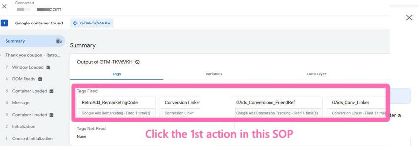 In the list of tags fired, look for the one corresponding to the conversion you’ve set up (in our example, ‘GAds_Conversions_FriendRef‘)