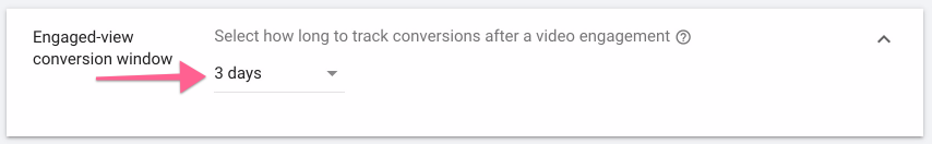 Engaged-view conversion window: Allows you to Select how long to track conversions after a video engagement. The engagement conversion window is the period of time after a person watches 10 seconds or more of your video ad. For example, if you set your engagement conversion window to 3 days, any conversion that happens more than 3 days after a person watches 10 seconds or more of your video ad won't be counted