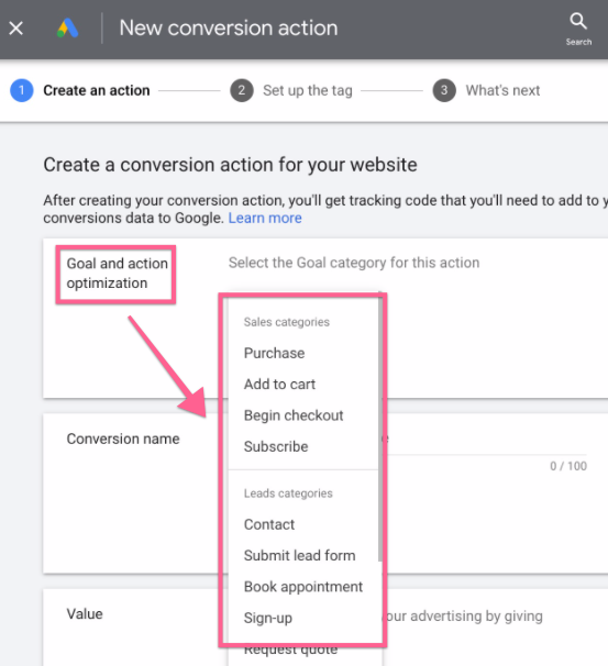Goal and action optimization: Select the category that best fits your conversion, this will not affect your tracking or the delivery of your ads. Instead, it will allow you to segment your conversions on your reports to analyze similar conversions together. The dropdown option will reveal 3 subcategories: