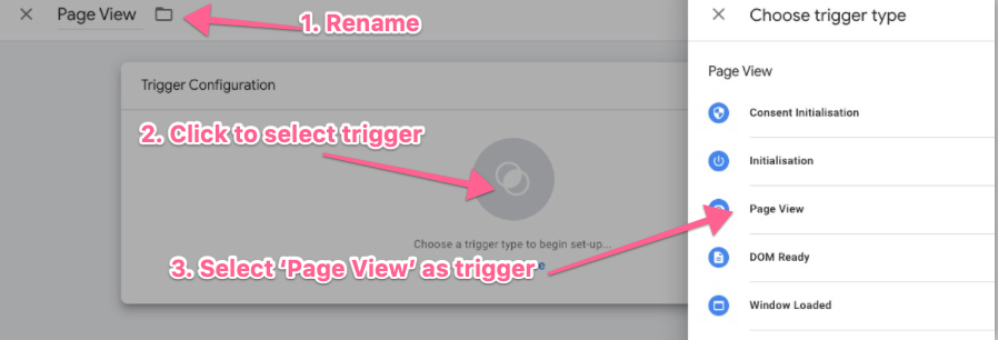 Rename your Trigger >> Click “Choose a trigger to begin setup >> Select “Page View”: