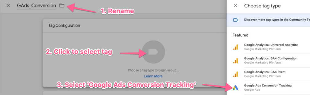 Under ‘Tag Configuration,’ click the tag icon above ‘Choose a tag type to begin setup’. From the dropdown list, select “Google Ads Conversion Tracking”.