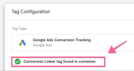 Back in the conversion tag setup page, you should then see the conversion linker tag enabled.