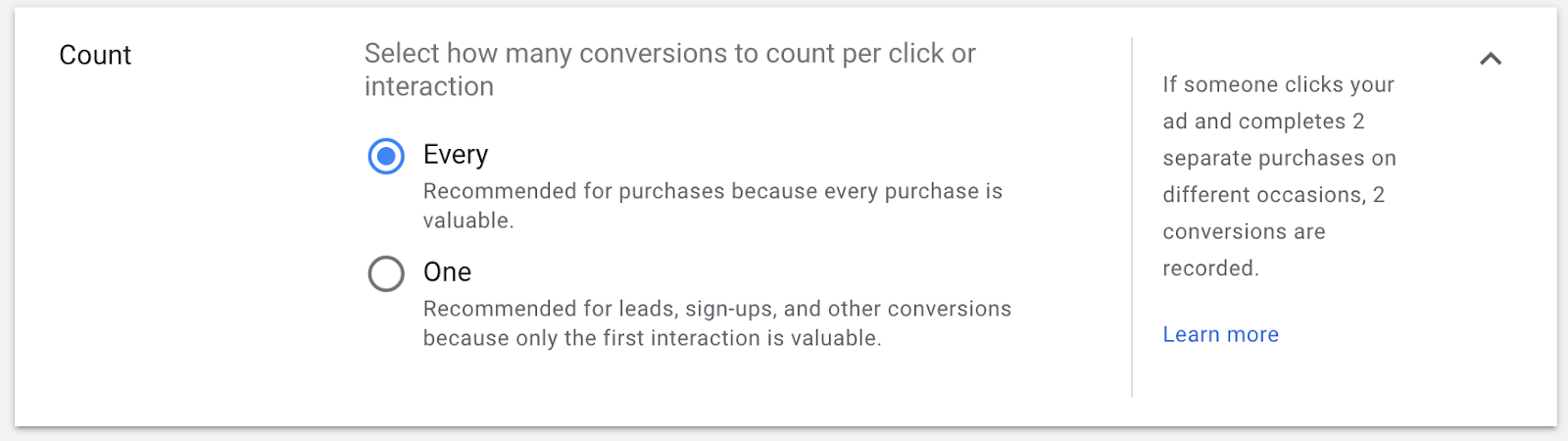 Every: Select this option if you would like this conversion to be counted every time it happens after an ad interaction. Usually, you will only want to select this option if the conversion adds value to your business, even if performed by the same visitor multiple times. (e.g., a purchase, booking an appointment for different times)