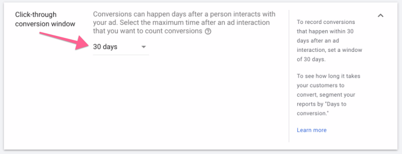 Note: If a conversion happens outside your selected conversion window, it will not be reported in Google Ads.