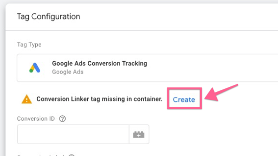 You’ll be asked to create a conversion linker tag. If you haven’t created it, click “Create”.