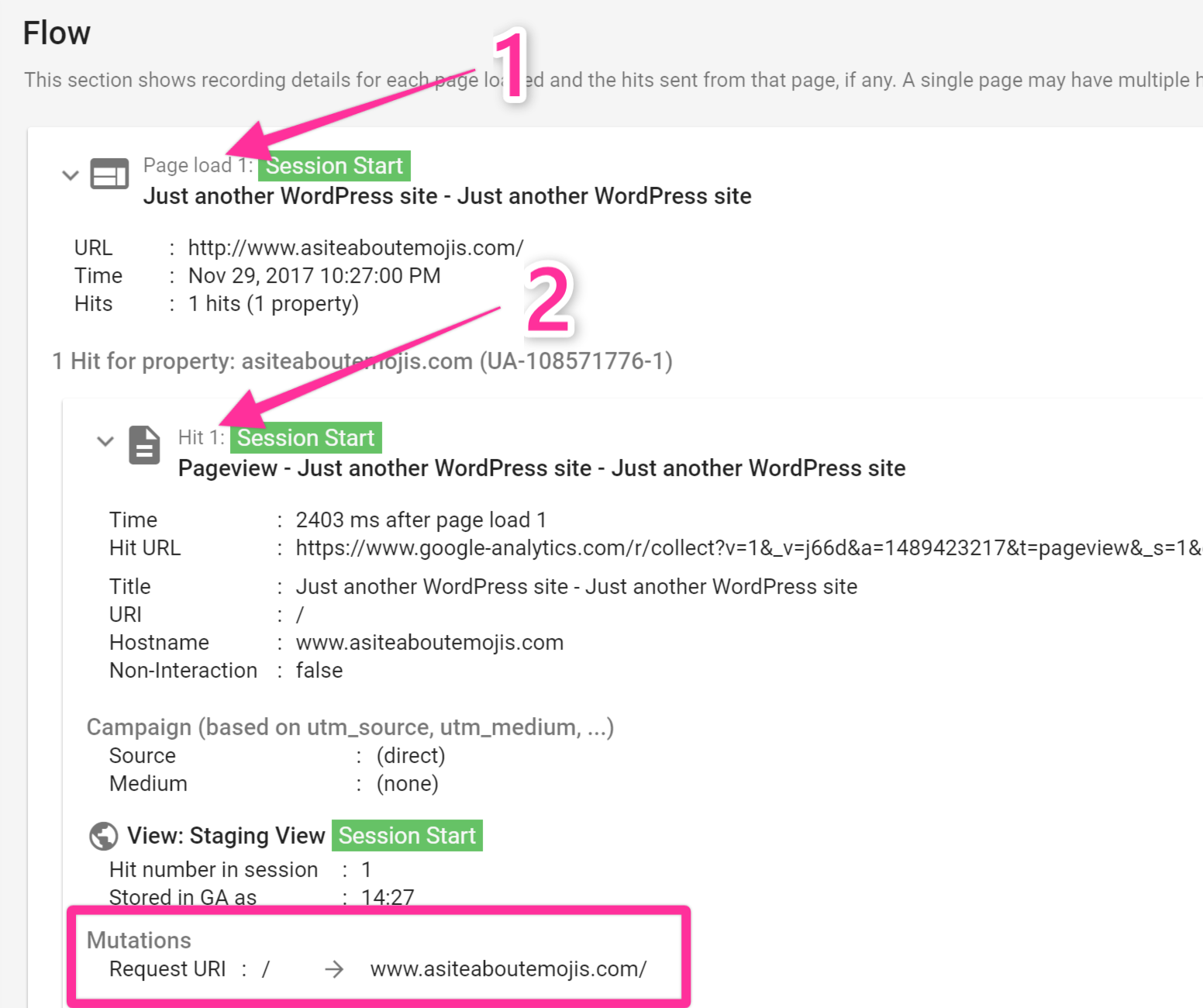 Scroll down in the report until you find the “Flow” section → Click “Page Load 1” → Click “Hit 1”. You should see the “Mutation” subsection displaying the transformation that occurred in your reported hit: